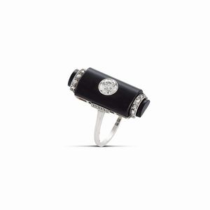 ANELLO GEOMETRICO CON ONICE E DIAMANTI in oro bianco 18kt, impreziosito da elementi in onice e rose di diamante, [..]