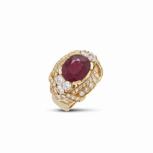 ANELLO CON RUBINO E DIAMANTI in oro giallo 18kt, impreziosito da un rubino taglio ovale di ct 4 circa e da diamanti [..]