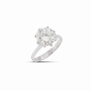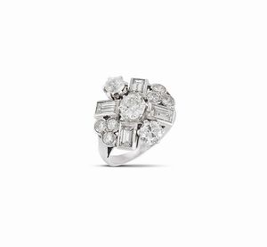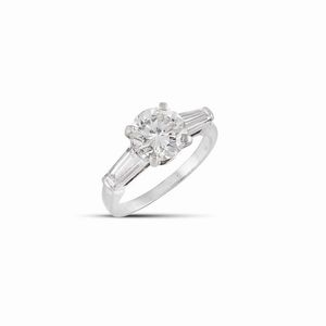 ANELLO CON DIAMANTI in platino, impreziosito al centro da un diamante taglio brillante di ct 1.40 circa, affiancato [..]