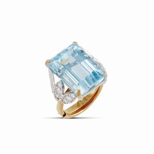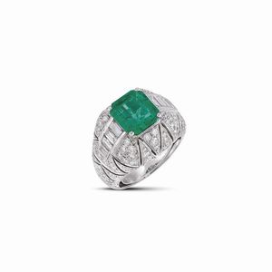 ANELLO GEOMETRICO CON SMERALDO E DIAMANTI in oro e platino, impreziosito al centro da uno smeraldo taglio ottagonale [..]