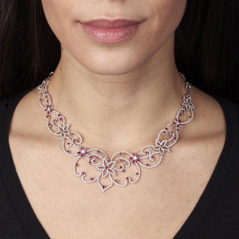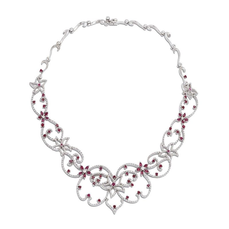 GIROCOLLO CON RUBINI E DIAMANTI in oro bianco 18kt, realizzato a forma di lungo tralcio fiorito, impreziosito da rubini taglio rotondo e navette per ct 3 circa e da diamanti taglio brillante per ct 7 circa, lungh. cm 39, gr. 58.