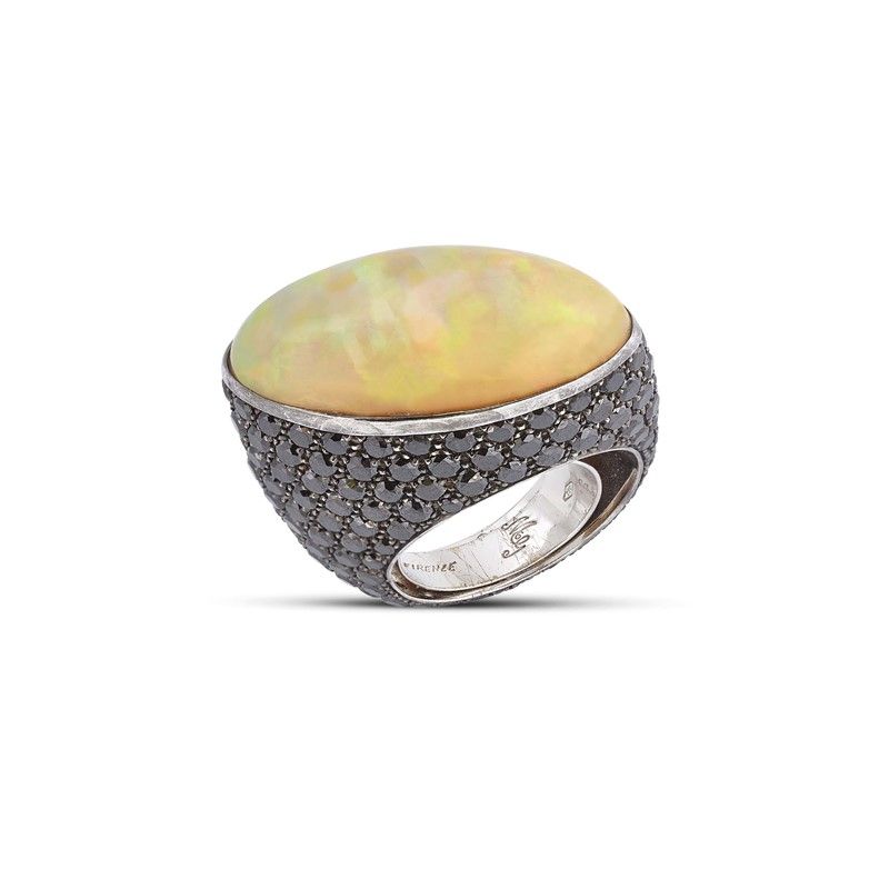 GRANDE ANELLO CON OPALE E DIAMANTI NERI in oro bianco 18kt, dall'aspetto geometrico che ricorda la forma di un'ellisse, recante sulla sommità un opale di ct 22 circa, circondato da pavé di diamanti neri per ct 14 circa, punzoni 750 e del fabbricante, mis. 54, gr. 25