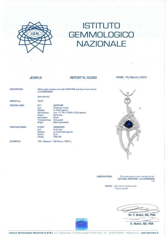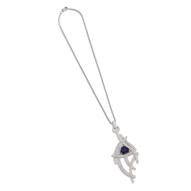 in oro bianco 18kt, composta da catena e pendente firmato, impreziosito da diamanti taglio huit huit per ct 2.30 circa, colore G/H, purezza Vvs/Vs, con al centro uno zaffiro taglio fantasia di ct 6.50 circa, punzoni 750 e del fabbricante, lungh. cm 41, dim. pendente cm 3,5x9, gr. 34. Corredato di certificato IGN del 10/03/2023 attestante le caratteristiche.