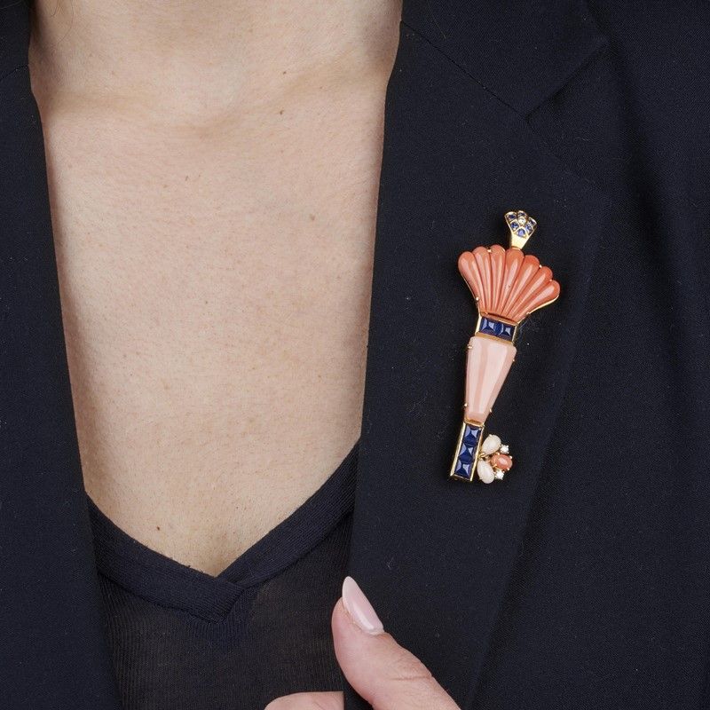 MORONI SPILLA-PENDENTE CON CORALLI ZAFFIRI E DIAMANTI in oro giallo 18kt, realizzata a forma di chiave, composta da parti in corallo e impreziosita da zaffiri taglio sugar loaf e rotondo per ct 3.70 circa, con tre diamanti taglio brillante per ct 0.20 circa, punzoni 750 e del fabbricante, dim. cm 3x8, gr. 22