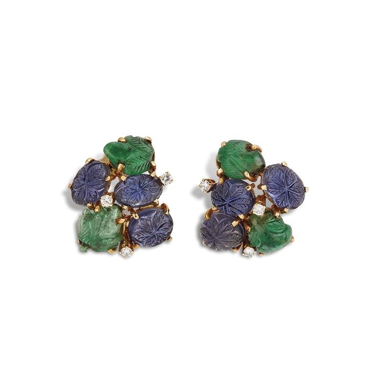 PAIO DI ORECCHINI A TRALCI CON PIETRE DI COLORE E DIAMANTI in oro giallo 18kt, composti da zaffiri e smeraldi raffiguranti delle foglie incise, impreziositi da diamanti taglio brillante per ct 0.30 circa, punzoni 750 e logo del fabbricante, chiusura a clip con perno, dim. cm 2x2,5, gr. 16 complessivi