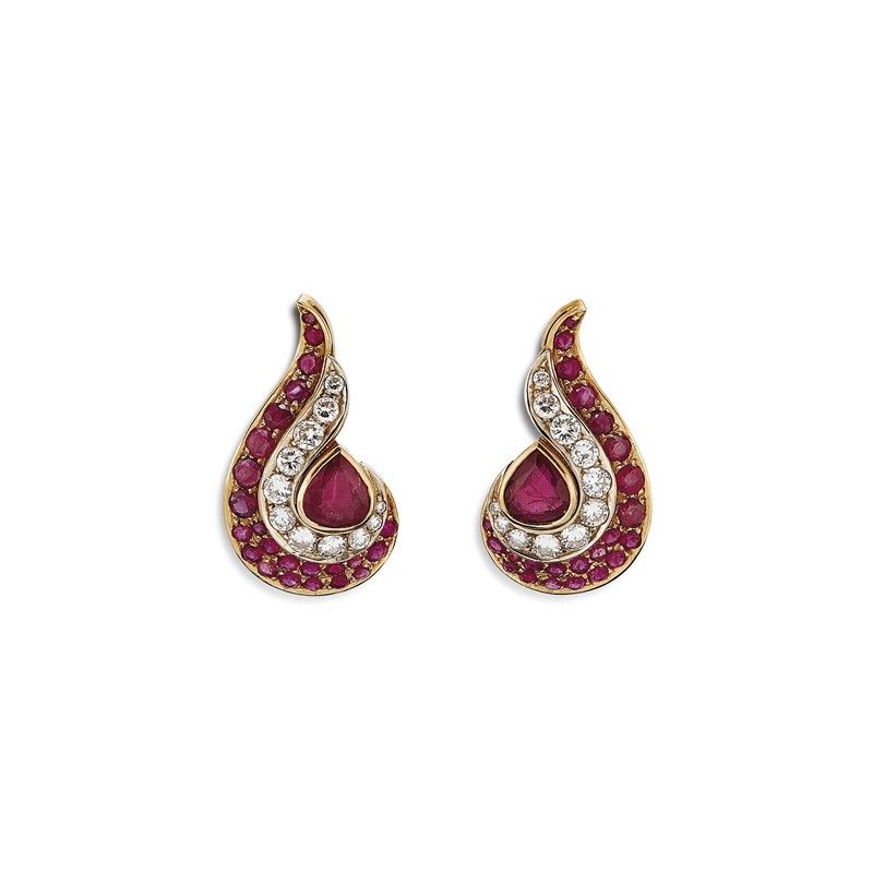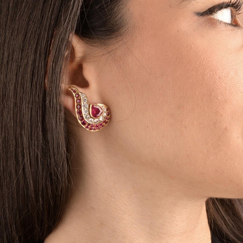 PAIO DI ORECCHINI A VOLUTE CON RUBINI E DIAMANTI in oro giallo 18kt, impreziositi da rubini taglio rotondo per ct 1.80 circa e due rubini taglio a goccia per ct 3.40 circa, chiusura a clip con perno, dim. cm 2x3 circa, gr. 15 complessivi