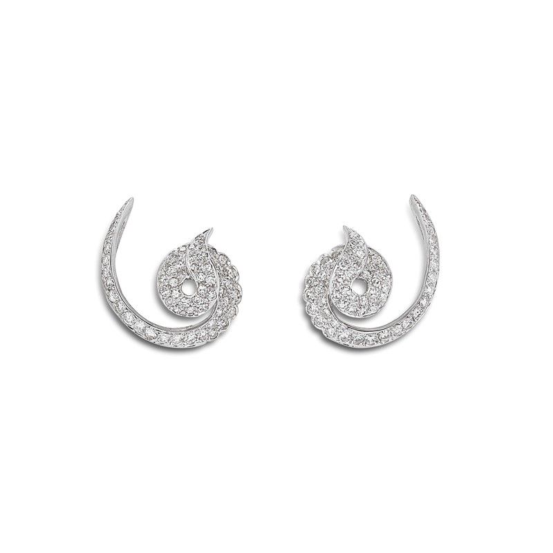in oro bianco 18kt, realizzati a forma di spirale, impreziositi da diamanti taglio huit huit per ct 2.20 circa, chiusura a clip con perno, dim. cm 2x2 circa, gr. 9 complessivi