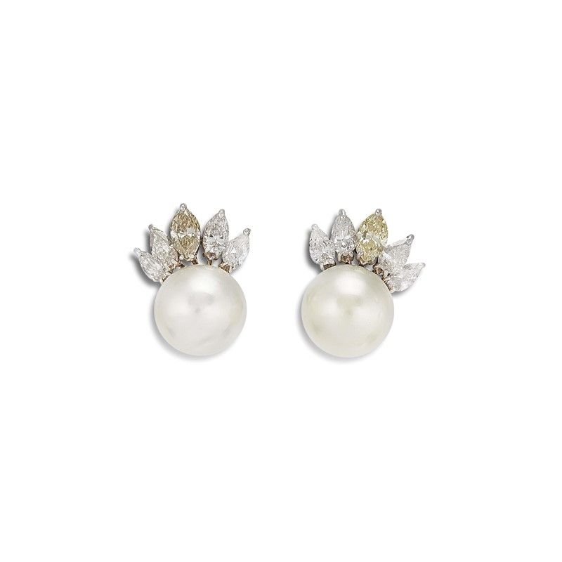 PAIO DI ORECCHINI CON PERLE SOUTH SEA E DIAMANTI in oro bianco 18kt, composti da perle di mm 14 circa sormontate da diamanti taglio a goccia e navette per ct 4.80 circa, punzone 750, chiusura a clip, dim. cm 2x2,5, gr. 16 complessivi