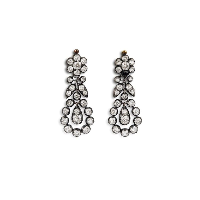 in oro e argento, realizzati a forma di tralci fioriti, impreziositi da diamanti taglio antico per ct 4 circa, dim. cm 1,5x4 circa, gr. 5 complessivi