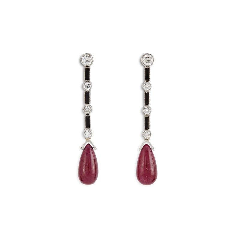 in oro bianco 18kt, composti da una fila di diamanti taglio brillante per ct 2.20 circa alternati a segmenti con intarsi in onice, da cui pendono due gocce d rubini di mm 15x7 circa, punzoni francesi, 750, 18kt e del fabbricante, chiusura farfallina a scatto, lungh. cm 4,5, gr. 8 complessivi