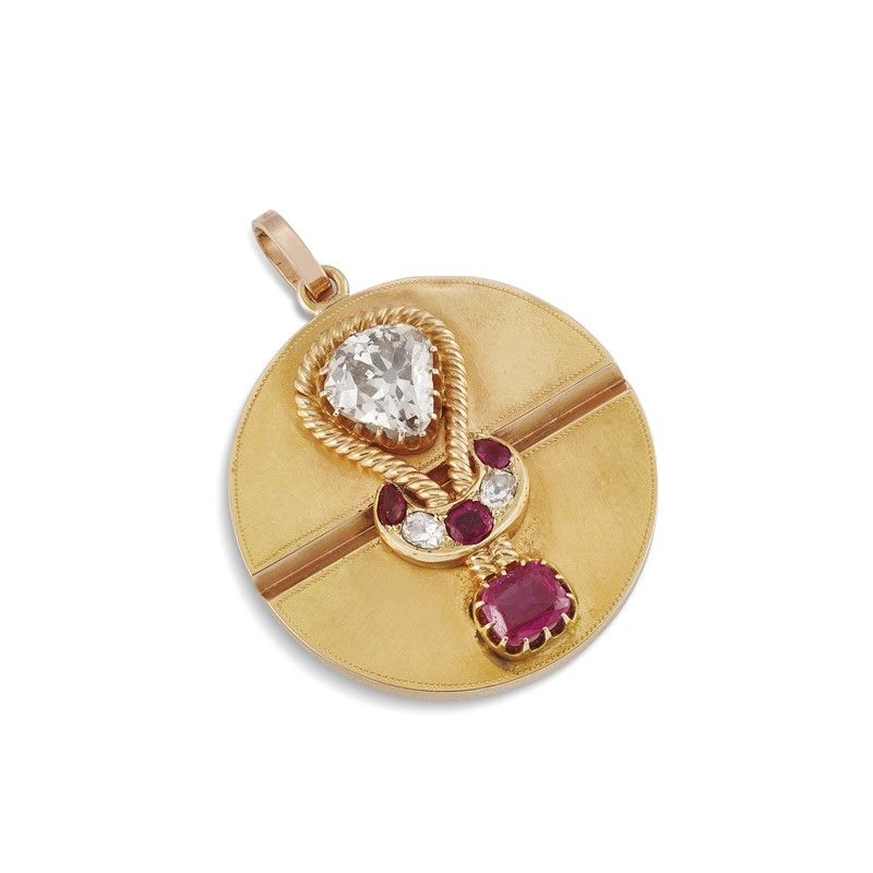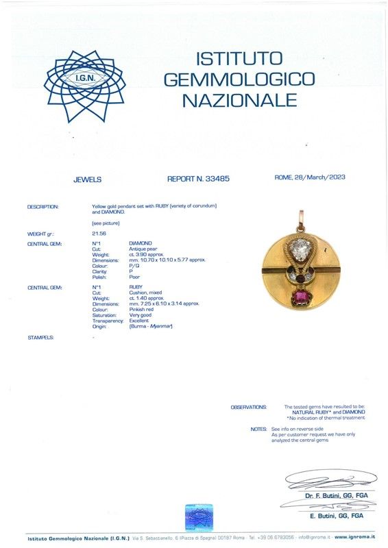 in oro giallo 18kt, di forma circolare, con al centro un motivo a nodo, impreziosito da un diamante taglio antico di ct 3.90 circa, colore P/Q, purezza I, un rubino birmano taglio cuscino di ct 1.40 circa, rubini taglio rotondo e diamanti taglio antico per ct 0.70 circa, dim. cm 4x5 circa, gr. 21. Corredato di certificato IGN del 28/03/2023 attestante le caratteristiche e l'assenza di trattamenti termici nel rubino.