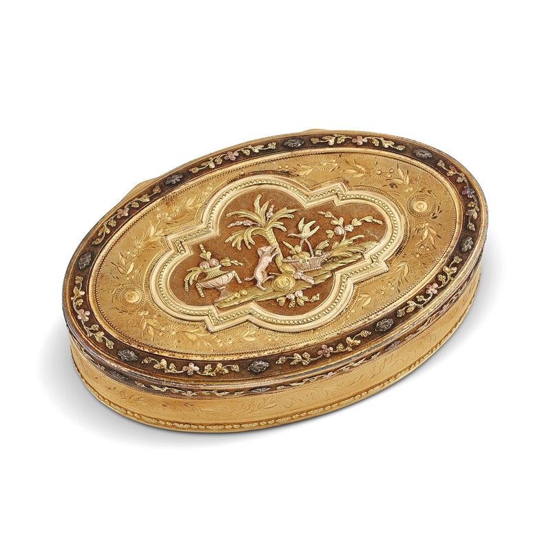 PICCOLA SCATOLA TABACCHIERA OVALE in oro giallo, rosa e argento, di forma ellittica, con decoro cesellato raffigurante tralci e ghirlande, al centro una scena pastorale entro cornice ad illustrare animali tra vasi e un cesto di frutta, dim. cm 7,5x5x1,5 circa, gr. 59
