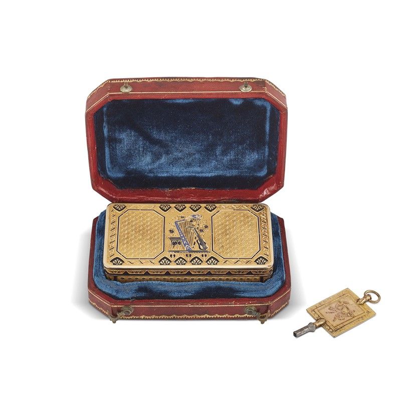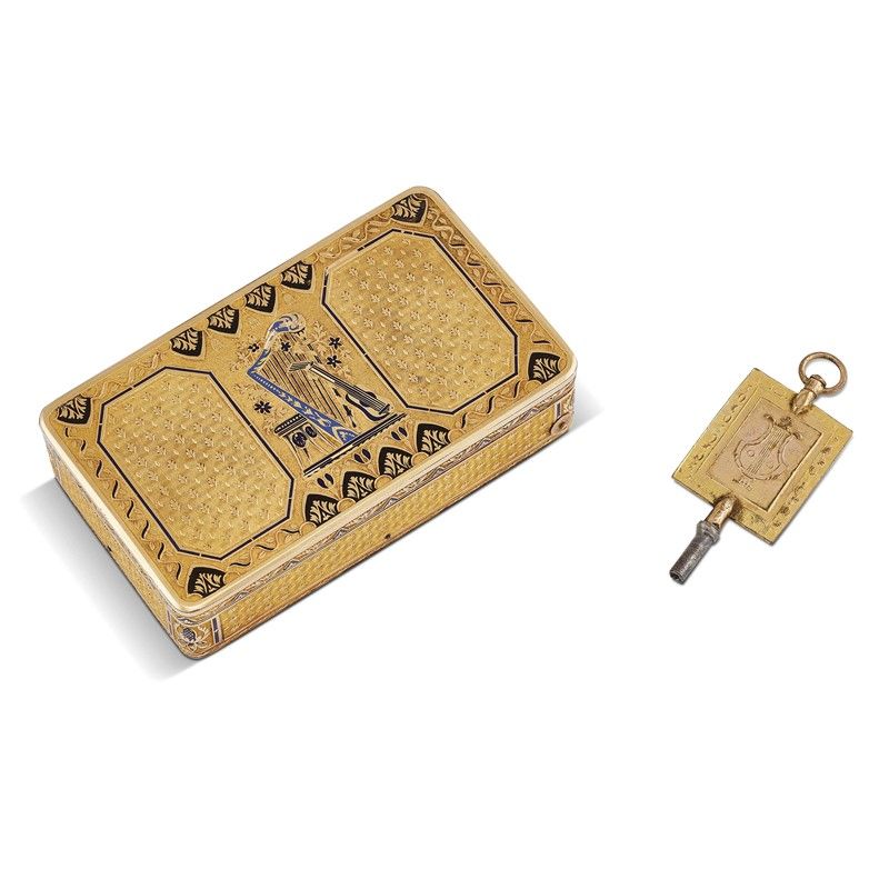SCATOLA MUSICALE CON CARILLON in oro giallo, di forma rettangolare con angoli arrotondati, decorata lungo tutto il profilo da tralci realizzati a rilievo e in smalto nero che vanno a incorniciare dei riquadri centrali raffiguranti piccole foglie su sfondo guilloscé, con al centro degli strumenti musicali circondati da rami fioriti. La base reca all'interno il movimento di un carillon funzionante tramite la rotazione di una leva con apposita chiave, punzoni francesi, dim. cm 8x5x2 circa, gr. 213. Corredata di scatola e chiave di carica.