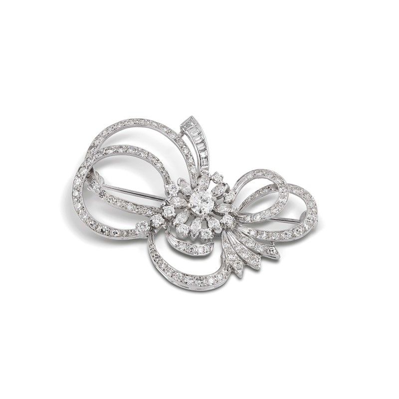 in platino, impreziosita da diamanti taglio vecchio, navette, baguette e huit huit per ct 2.60 circa, punzone PLATINE, dim. cm 5x3,5 circa, gr. 12