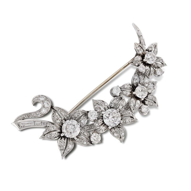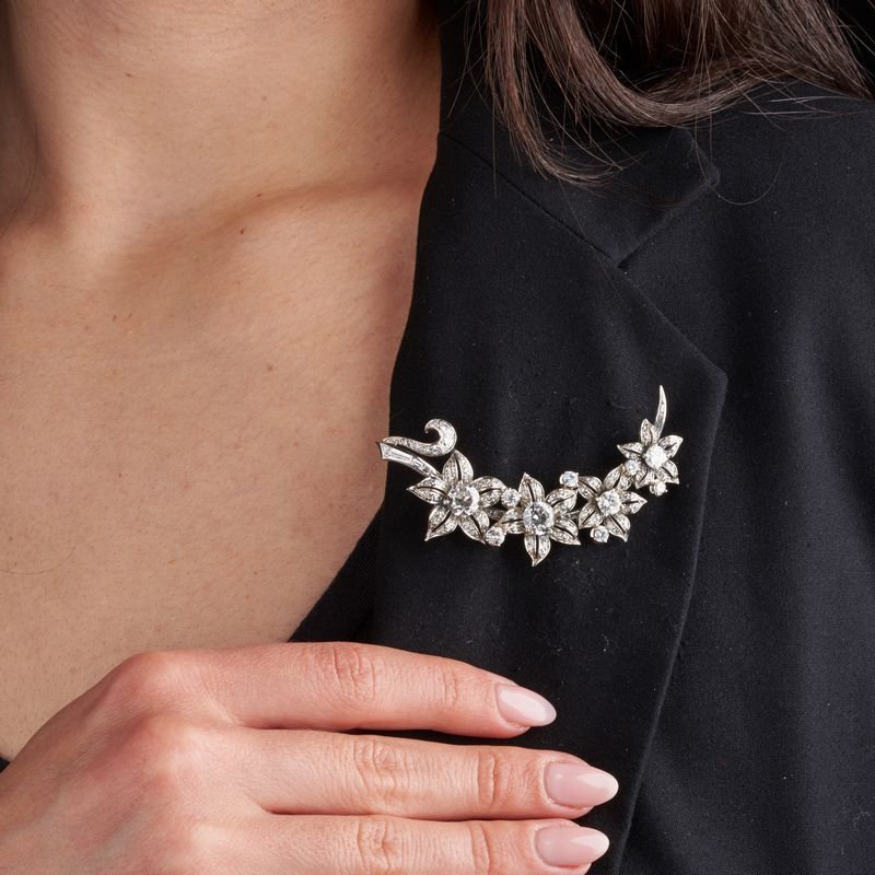 FLOWERING BRANCH-SHAPED DIAMOND BROOCH IN 18KT WHITE GOLD