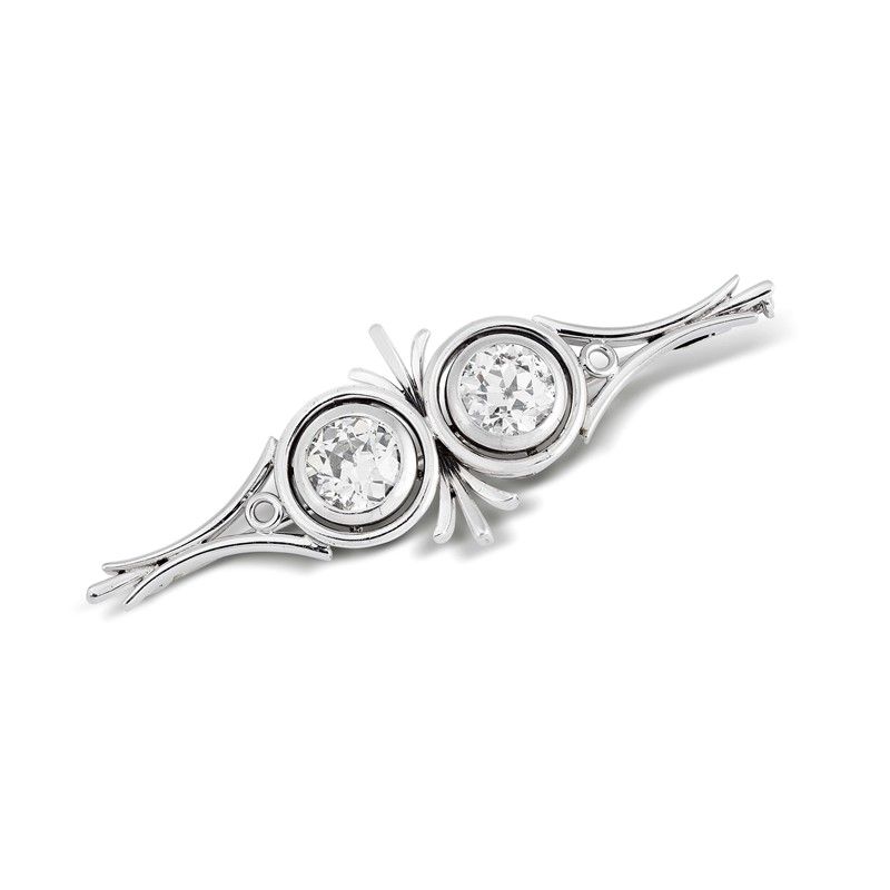 in oro bianco 18kt, impreziosita da due diamanti taglio vecchio di cui uno ct 1.20 circa e l'altro ct 0.90 circa, dim. cm 5,5x1,5, gr. 8