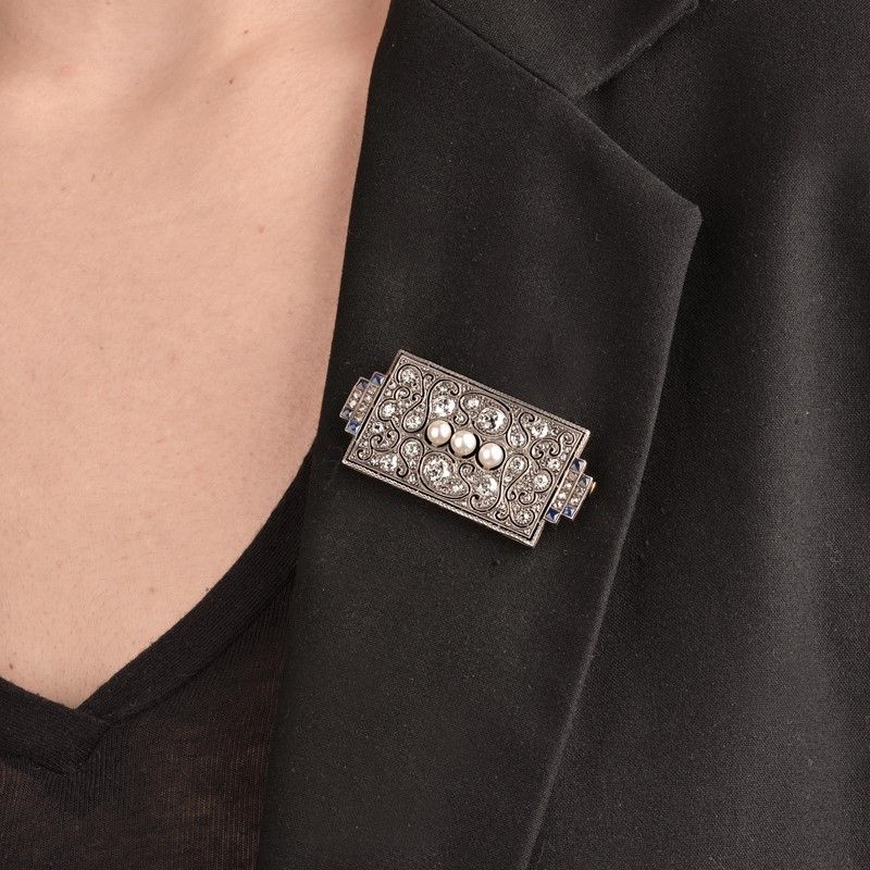SPILLA CON PERLE ZAFFIRI E DIAMANTI in oro e argento, di forma geometrica con parte rettangolare traforata, impreziosita al centro da tre perle di mm 4 circa circondate da diamanti taglio antico per ct 2.20 circa, affiancati da quattro zaffiri taglio fantasia e rose di diamante, dim. cm 5x2,5, gr. 12