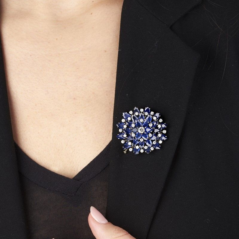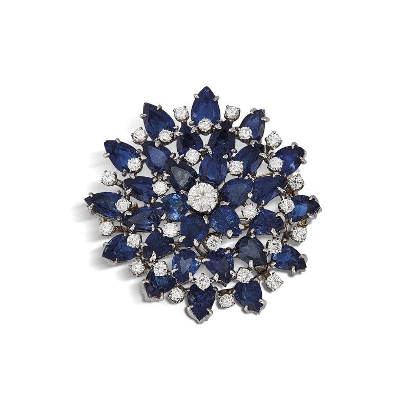 SPILLA FLOREALE CON ZAFFIRI E DIAMANTI in oro bianco 18kt, impreziosita da file di diamanti taglio brillante per ct 1.20 circa alternati a zaffiri taglio a goccia per ct 12 circa, con al centro un diamante taglio brillante di ct 0.40 circa, punzoni francesi, dim. cm 3,5x3,5, gr. 25