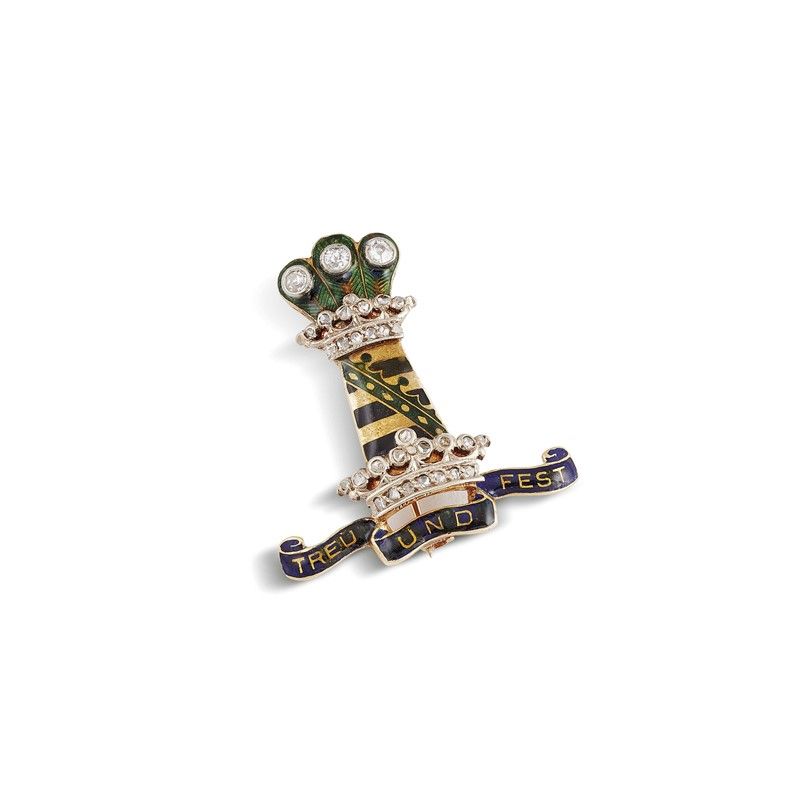 in oro e argento, decorata in smalto, impreziosita da diamanti taglio vecchio e a rosa per ct 0.15 circa, recante la scritta "Treu und Fest" (de: "Fedele e forte"), dim. cm 2,5x3, gr. 6