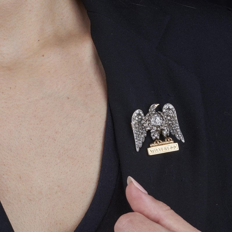 SPILLA REGIMENTAL ROYAL SCOTS DRAGOON GUARDS in oro e argento, realizzata a forma di aquila con al centro una foglia d'alloro, impreziosita da diamanti taglio vecchio e a rosa (uno mancante) per ct 1.40 circa e un rubino taglio cabochon, poggiante su una targhetta con scritto 'WATERLOO', dim. cm 3,5x3,5, gr. 14