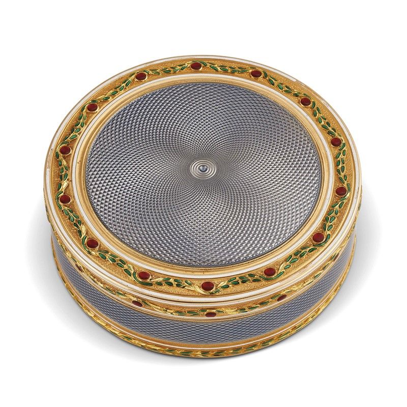 in oro giallo, corpo e coperchio decorati in smalti policromi su fondo guilloche a motivi concentrici, bordi cesellati e smaltati con ghirlande di alloro e bacche rosse, punzoni francesi del maestro orafo Joseph Etienne Blerzy, lettera della data, marchi charge e décharge del verificatore Jean-Baptiste Fouache (1774-1780), n. 396 inciso sul bordo, dim. cm 7x7x2 circa, gr. 122