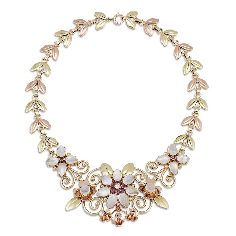 TIFFANY & CO. COLLANA A FORMA DI TRALCIO FIORITO in oro giallo e rosa 14kt, realizzato a forma di foglie e fiori impreziositi da pietre di luna taglio cabochon, rubini taglio rotondo per ct 1.50 circa e un diamante taglio brillante di ct 0.10 circa, firmata "Tiffany & Co.", punzone 14kt, lungh. cm 40, gr. 73