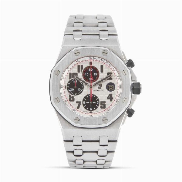 cassa in acciaio, fondello e lunetta serrati con viti, pulsanti a pompa e corona rivestiti in gomma nera, quadrante argenté con contatori cronografici a contrasto, scala tachimetrica sul disco rehaut, contatore dei secondi a ore dodici, dei minuti a ore nove, delle ore alle sei, numeri arabi applicati, datario a ore tre, movimento a carica automatica, bracciale a maglie in acciaio, lungh. interna cm 20, chiusura doppia deployant marcata AP, vetro minerale. Diam. mm 44