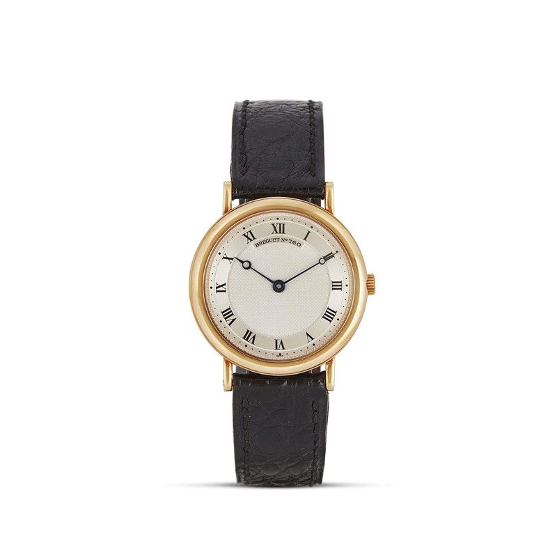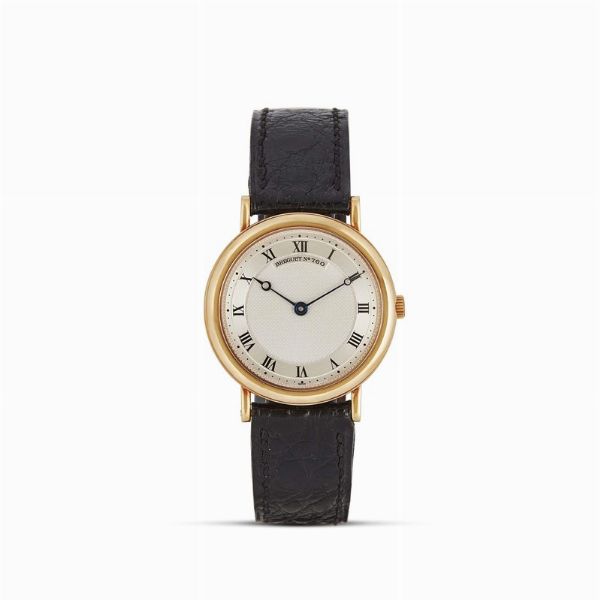 cassa in oro giallo 18kt, fondello a pressione, lunetta liscia in oro giallo 18kt, quadrante argenté, numeri romani, lancette breguet, movimento a carica manuale cal 818/4, cinturino non originale in pelle nera lucida, fibbia in oro giallo 18kt non originale, vetro minerale, gr. 37. Diam. mm 31. Corredato di garanzia.