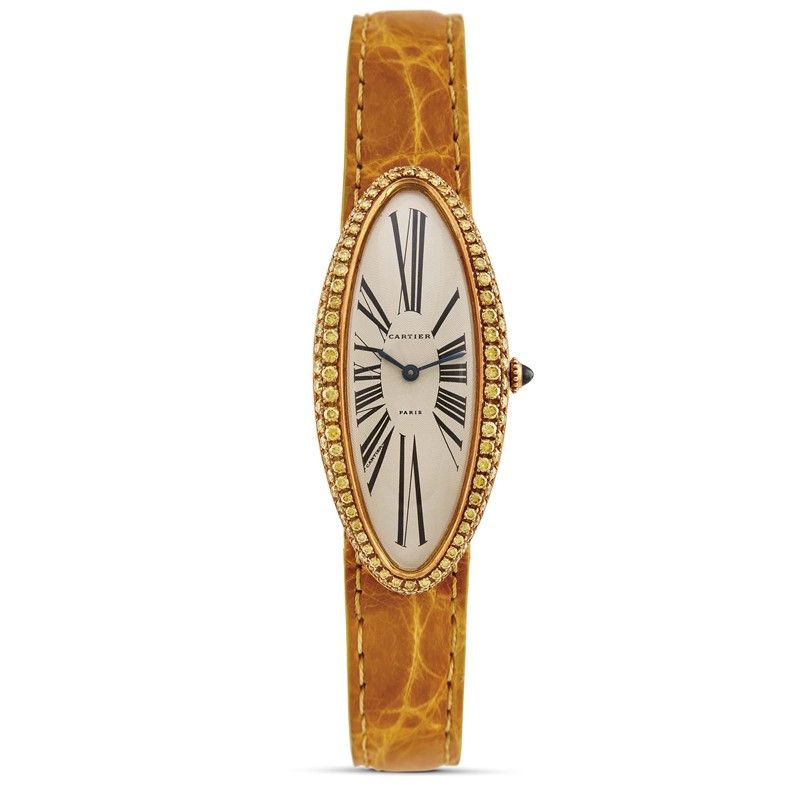 cassa in oro giallo 18kt, fondello serrato con viti firmato Cartier, lunetta impreziosita con due file di diamanti fancy applicati successivamente, corona con zaffiro cabochon, quadrante guilloché firmato Cartier Paris, numeri romani, movimento a carica manuale, cinturino in pelle ocra, lungh. interna cm 14, fibbia deployant firmata Cartier in oro giallo 18kt, vetro minerale, gr. complessivi 47. Diam. mm 24x53