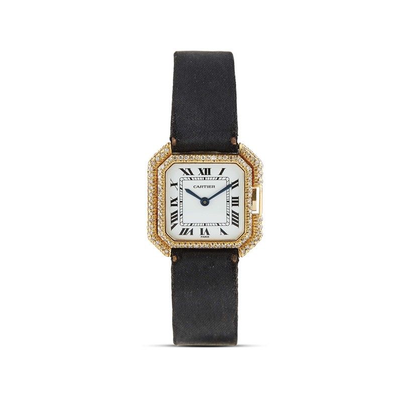 cassa di forma ottagonale in oro giallo 18kt, fondello serrato con viti, lunetta a scalino impreziosita da tre file di piccoli diamanti, quadrante bianco con numeri romani, movimento a carica manuale Cartier cal. 78-1, su base ETA 2512-2 , cinturino in seta nero, boucle deployant fissa in oro giallo 18kt firmata Cartier, vetro minerale, gr complessivi 31. Dim. mm 24x24