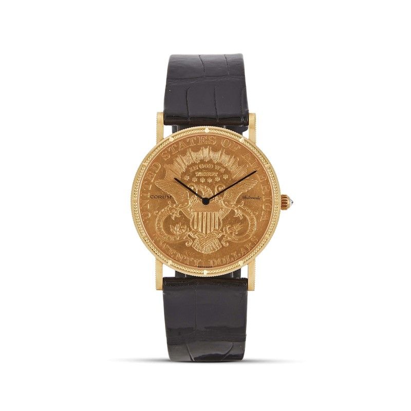 CORUM OROLOGIO MONETA DA 20$ AMERICANI cassa in oro giallo 18kt ricavata da moneta, fondello a pressione, corona con diamante, grafica nera, movimento a carica automatica n. 613305, cinturino originale in pelle nera, fibbia in oro giallo 18kt marcata Corum, vetro minerale, gr. 48. Diam. mm 35.