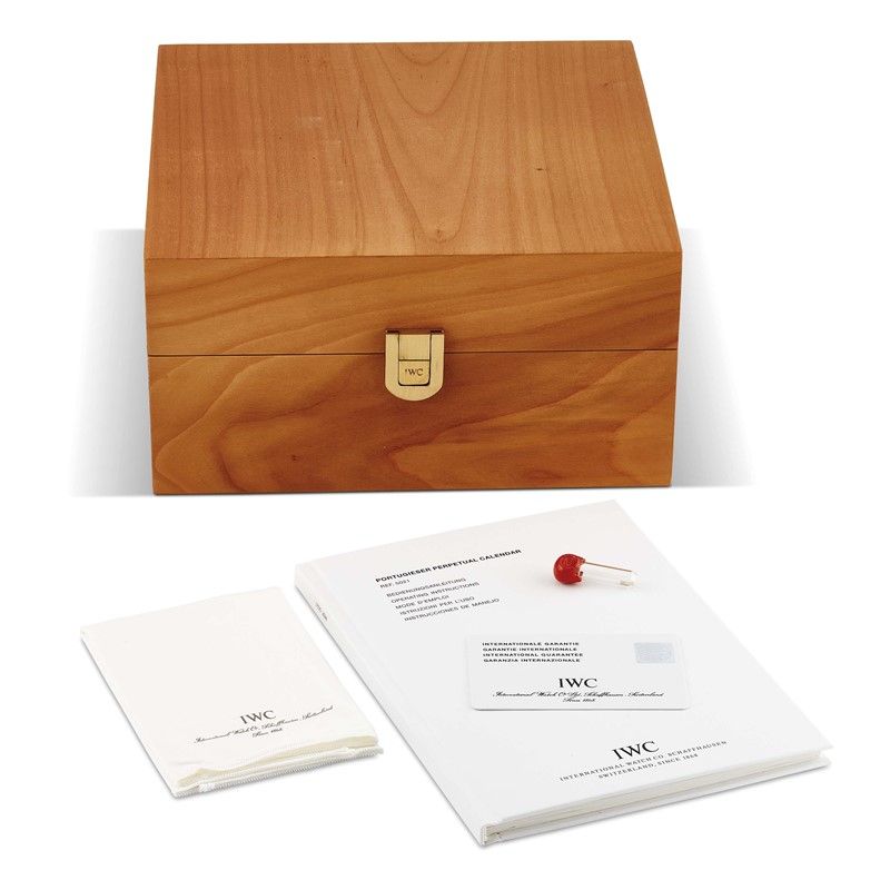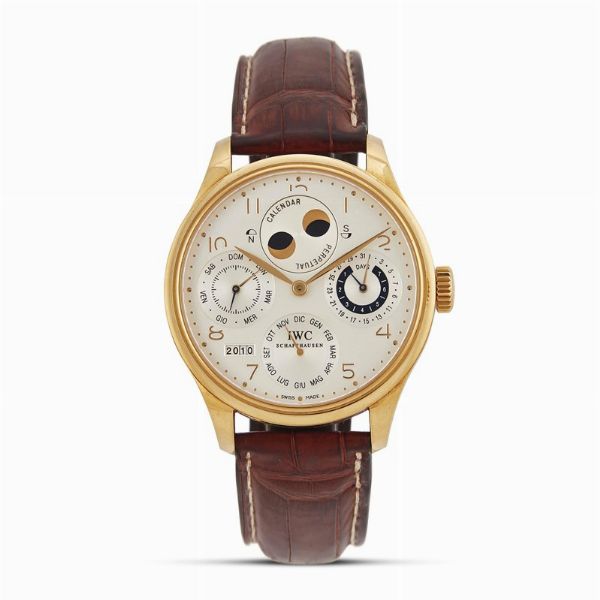 cassa in oro giallo 18kt, fondello serrato con viti con movimento a vista, corona marcata, quadrante argenté, numeri arabi applicati, contatore dei secondi a ore nove, calendario perpetuo e fasi lunari, movimento a carica manuale cal C.50611 n. 2930247, cinturino in pelle marrone non originale, fibbia in oro giallo 18kt marcata IWC, vetro minerale, gr. 164. Diam. mm 44. Corredato di scatola e garanzia.