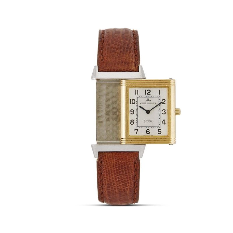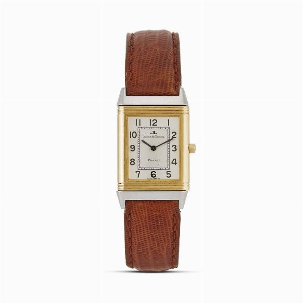cassa di forma rettangolare in oro giallo con sistema a scorrimento e alloggio in acciaio, fondello recante personalizzazione in lettere "M. L.", corona marcata, quadrante argenté, grafica di colore nero, numeri arabi stampati, movimento a carica manuale, cinturino in pelle marrone, fibbia in acciaio marcata Jaeger LeCoultre, vetro minerale, gr. 42. Dim. mm 23x38.