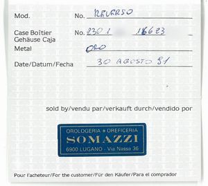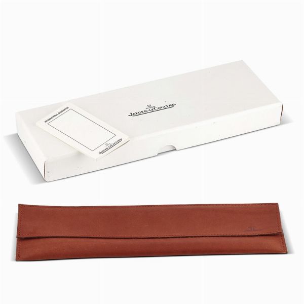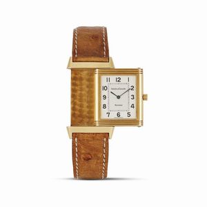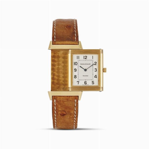 cassa di forma rettangolare in oro giallo 18kt con sistema a scorrimento e alloggio in oro giallo, quadrante argenté, grafica di colore nero, numeri arabi stampati, movimento a carica manuale, cinturino originale in pelle marrone, fibbia in metallo dorato marcata Jaeger LeCoultre, vetro minerale, gr. 44. Dim. mm 23x38. Corredato di scatola e garanzia.
