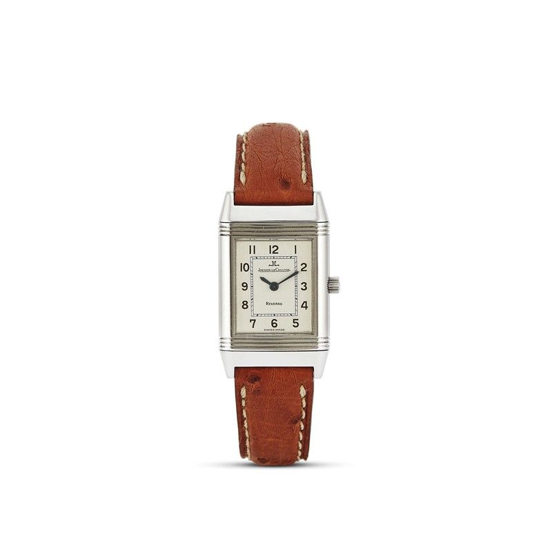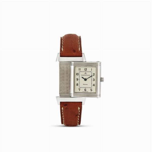 cassa di forma rettangolare con sistema a scorrimento e alloggio in acciaio, fondello recante personalizzazione in lettere "B. M.", corona marcata, quadrante argenté, grafica di colore nero, numeri arabi stampati, movimento al quarzo, cinturino originale in pelle marrone, fibbia in acciaio marcata Jaeger LeCoultre, vetro minerale. Dim. mm 19x34