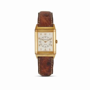 cassa di forma rettangolare in oro giallo 18kt con sistema a scorrimento e alloggio in oro giallo, fondello recante personalizzazione in lettere "G.R.", quadrante argenté, grafica di colore nero, numeri arabi applicati, movimento a carica manuale, cinturino originale in pelle marrone, fibbia deployant in oro giallo 18kt marcata Jaeger LeCoultre, vetro minerale, gr. 55. Dim. mm 28x33