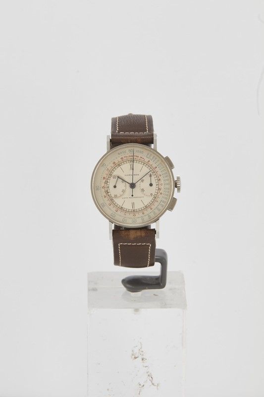 cassa in acciaio staybrite, fondello a pressione, tasti del crono rettangolari, quadrante argenté originale, grafica nera rossa e blu, scala tachimetrica e telemetrica, contatore dei secondi a ore nove, contatore dei minuti a ore tre, movimento a carica manuale cal 13ZN n. 6012218, cinturino in pelle marrone non originale, fibbia in metallo, vetro plastica. Diam. mm 36. Corredato di estratto di archivio.