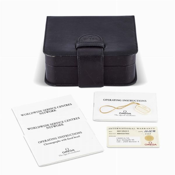 cassa in acciaio, fondello a vite con movimento a vista, tasti a pompa, corona marcata, ghiera con inserto nero e scala tachimetrica, quadrante nero firmato Omega, grafica bianca, indici al trizio, contatore dei secondi a ore nove, contatore dei minuti a ore tre, contatore delle ore alle sei, movimento a carica manuale cal 1863 n. 48403760, cinturino in pelle marrone non originale, fibbia in acciaio marcata Omega, vetro plastica. Diam. mm 42