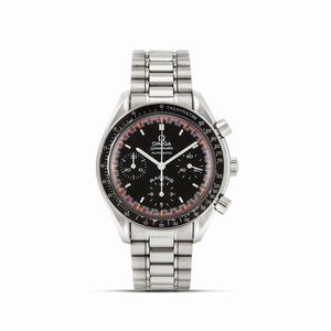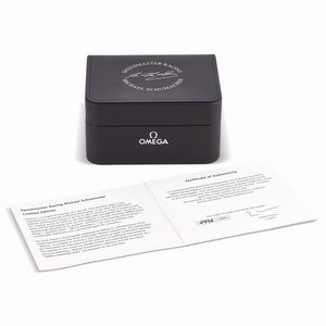cassa in acciaio, fondello a scatto, coperchio antimagnetico, tasti a pompa, corona marcata, ghiera con inserto nero e scala tachimetrica, quadrante nero, grafica bianca, contatore dei secondi a ore nove, contatore dei minuti a ore tre, contatore delle ore alle sei, movimento a carica automatica, bracciale a maglie piene in acciaio finali 811, lungh. interna cm 19, chiusura a scomparsa in acciaio marcata Omega, vetro plastica. Diam. mm 39. Corredato di scatola e certificato di autenticità.