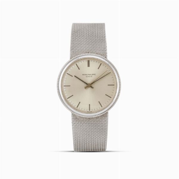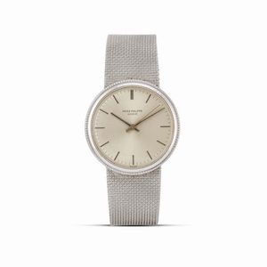 cassa in oro bianco 18kt, fondello a vite, quadrante argenté, indici applicati, rimessa dell'ora posta sul fondello, movimento a carica automatica, bracciale integrato a maglia tessita in oro bianco 18kt, chiusura a scomparsa in oro bianco 18kt marcata Patek Philippe, vetro minerale, gr. 100. Diam. mm 34. Corredato di scatola.