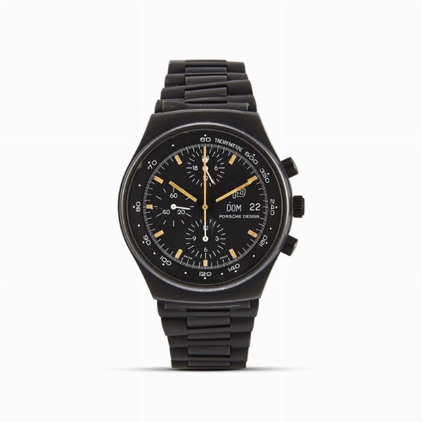 cassa in acciaio PVD, fondello a vite, tasti del crono a pompa, quadrante nero con scala tachimetrica sul disco rehaut, grafica bianca, contatore dei secondi a ore nove, contatore dei minuti a ore sei, indicazione delle 24 ore alle dodici, datario a doppia finestra con giorno del mese e della settimana, movimento a carica automatica cal 5100 n. 04055760, bracciale a maglie in acciaio PVD, lungh. interna cm 19, chiusura a scatoletta marcata Porsche Design, vetro minerale. Diam. mm 40