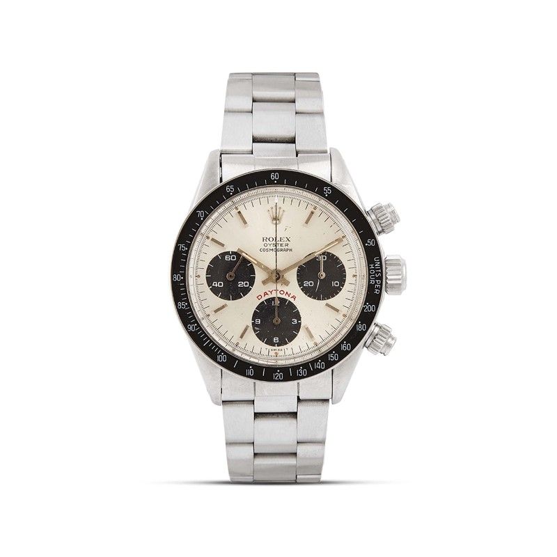 cassa oyster in acciaio, fondello serrato a vite, corona marcata, pulsanti a vite, ghiera con inserto nero con scala tachimetrica a 200, quadrante argentè con contatori a contrasto, grafica nera, indici applicati con trizio, scritta Daytona in rosso, contatore dei secondi a ore nove, contatore dei minuti a ore tre, contatore delle ore alle sei, movimento a carica manuale Valjoux 727, bracciale oyster ref. 78350 finali 571 cod. produzione N11, lungh. interna cm 20, chiusura a scatoletta marcata Rolex, vetro plastica. Diam. mm 37. Corredato di scatola e garanzia.