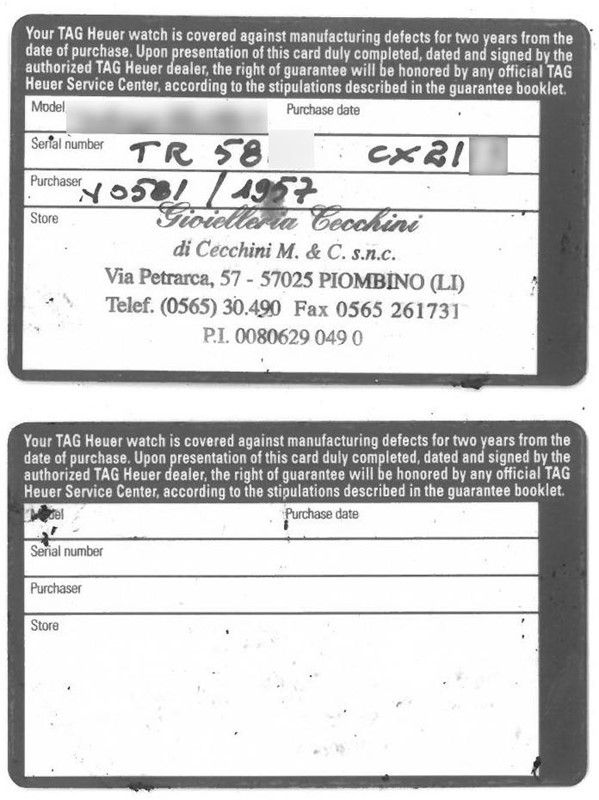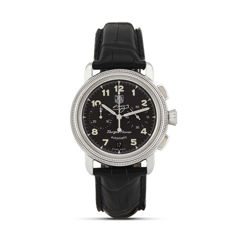 cassa in acciaio, fondello serrato con viti con incisione Targa Florio Tribute to Juan Manuel Fangio, tasti del crono rettangolari, ghiera zigrinata a scalino, quadrante nero, grafica bianca, numeri arabi luminescenti, contatore dei secondi a ore tre, contatore dei minuti a ore nove, datario a ore sei, movimento a carica automatica cal 17, cinturino in pelle nera, lungh. interna 19 circa, chiusura deployant a scomparsa marcata Tag Heuer, vetro minerale. Diam. mm 40. Corredato di scatola e garanzia.