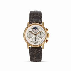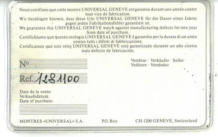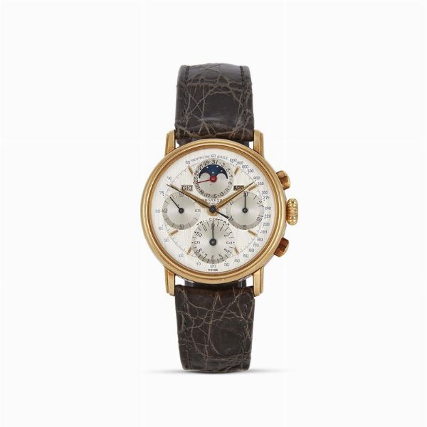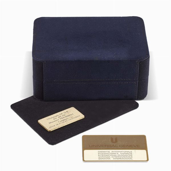cassa in oro giallo 18kt, fondello a pressione, tasti del crono a oliva, lunetta a scalino, quadrante argenté con quattro contatori, grafica nera e blu, scala tachimetrica, calendario completo, fasi lunari, contatore dei secondi a ore nove, contatore minuti a ore tre, contatore delle ore alle sei, indici applicati, movimento a carica manuale cal 281, cinturino originale in pelle marrone, fibbia in metallo dorato marcata Universal Geneve, vetro plastica, gr. 42. Diam. mm 33. Corredato di scatola e garanzia.