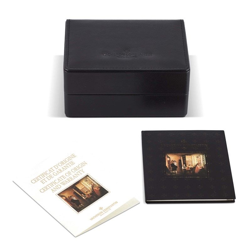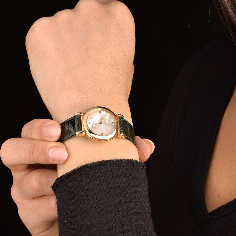 cassa in oro giallo 18kt, fondello con movimento a vista, anse sagomate mobili, lunetta liscia in oro giallo 18kt, quadrante in madreperla, numeri romani applicati, movimento a carica manuale cal 1055, cinturino originale in pelle verde, fibbia doppia deployant in oro giallo 18kt marcata Vacheron Constantin, vetro minerale, gr. 40. Diam. mm 26. Corredato di scatola e garanzia.