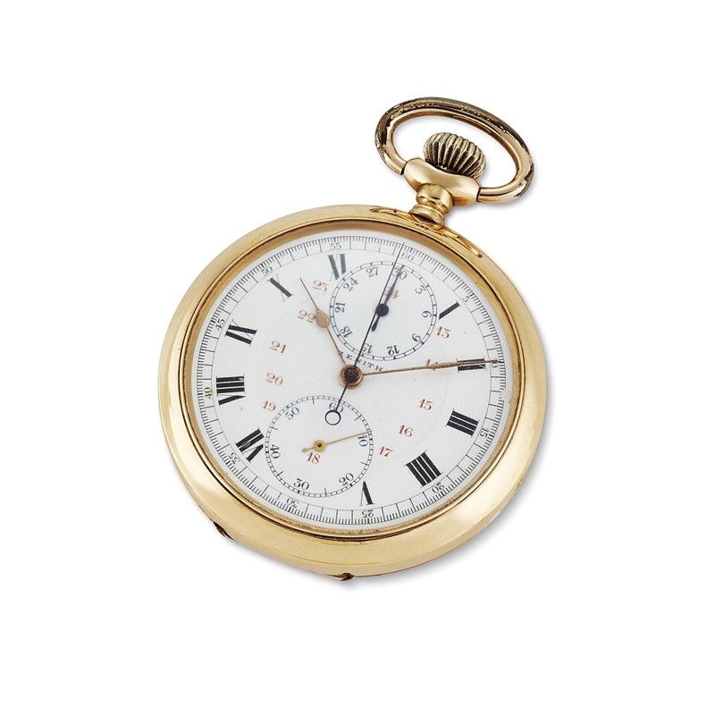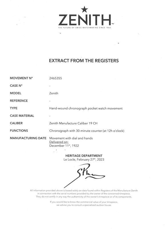 ZENITH OROLOGIO DA TASCA CRONOGRAFO MONOPULSANTE N. 24653XX cassa in oro giallo 18kt, quadrante bianco, grafica nera, numeri romani in nero e numeri arabi centrali in rosso, secondi a ore sei, contatore dei minuti a ore dodici, movimento a carica manuale n. 2465355, gr. 86. Diam. mm 51. Corredato di estratto di archivio. ZENITH YELLOW GOLD MONOPUSHER CHRONOGRAPH POCKET WATCH N. 24653XX