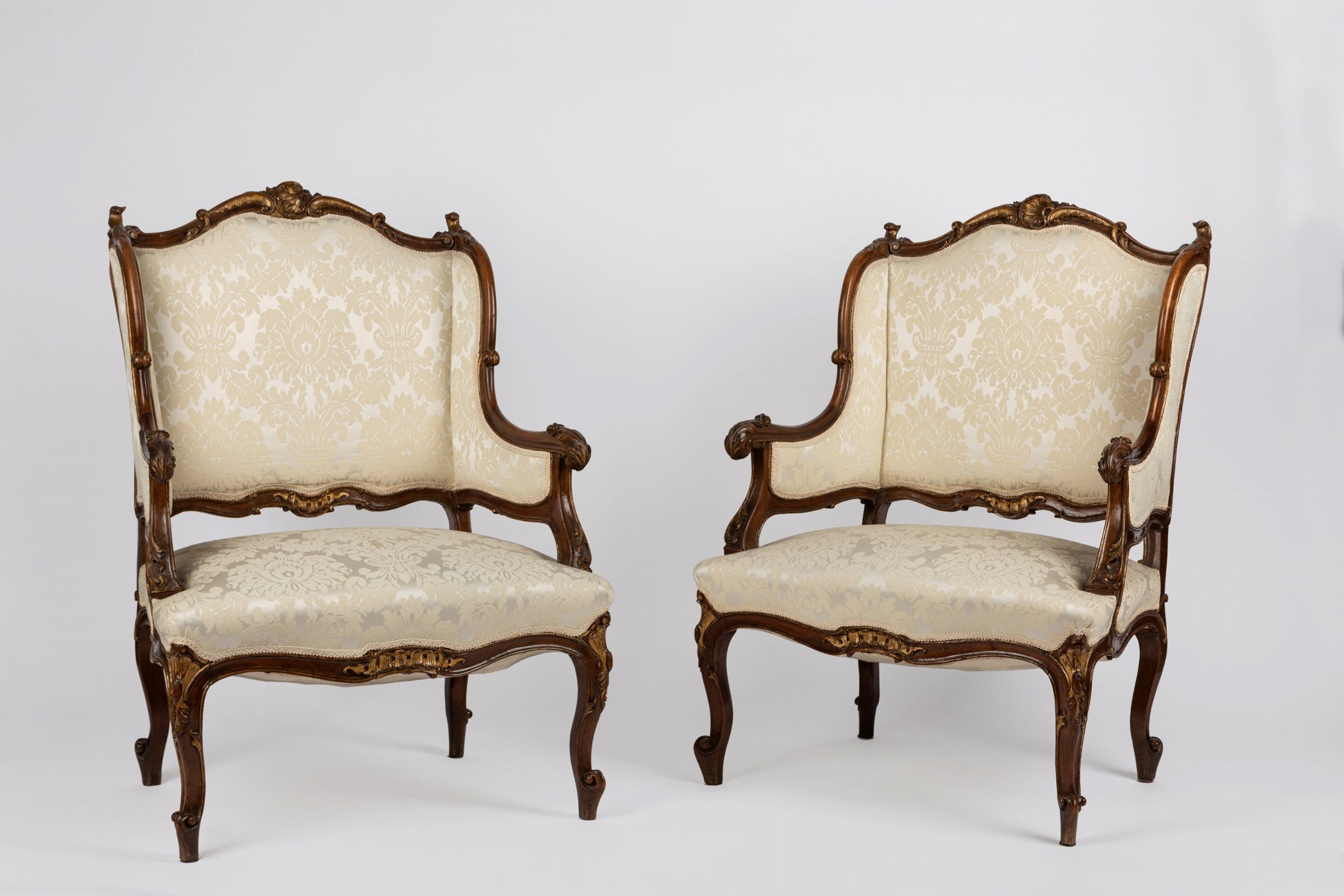 Coppia di poltrone in legno intagliato a rocailles. Secolo XX