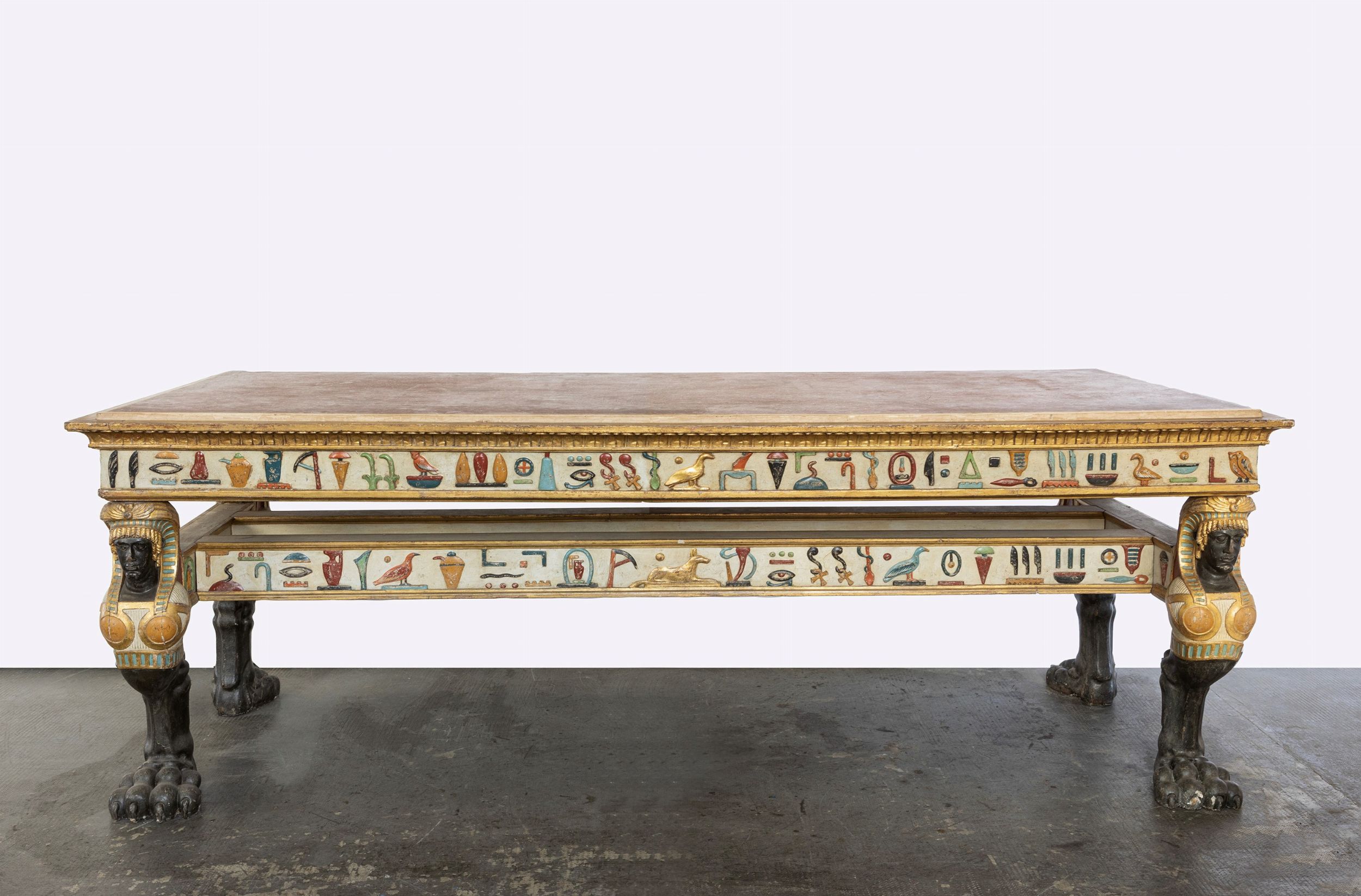 parzialmente dorato, piedi ferini, gambe a guisa di sfingi, la fascia decorata con geroglifici policromi a rilievo, il piano in scagliola a finto porfido.