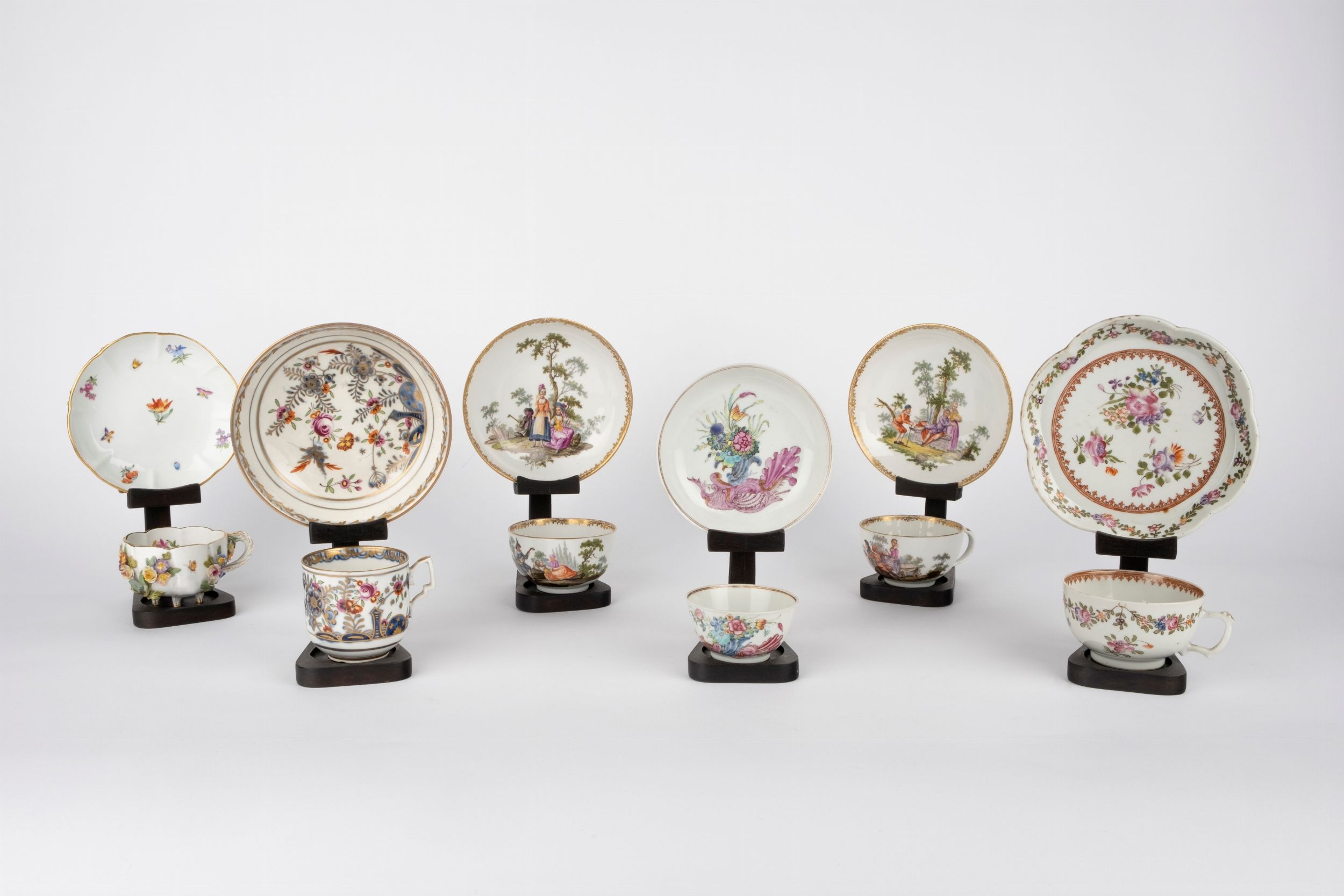 (misure diverse) di cui una coppia manifattura di Maissen, decorate con personaggi, una tazzina manifattura di Vienna, con fiori a rilievo; una tazzina con piattino manifattura di Vienna e una tazzina con piattino a decoro floreale e una tazzina a decoro floreale con bordo sagomato