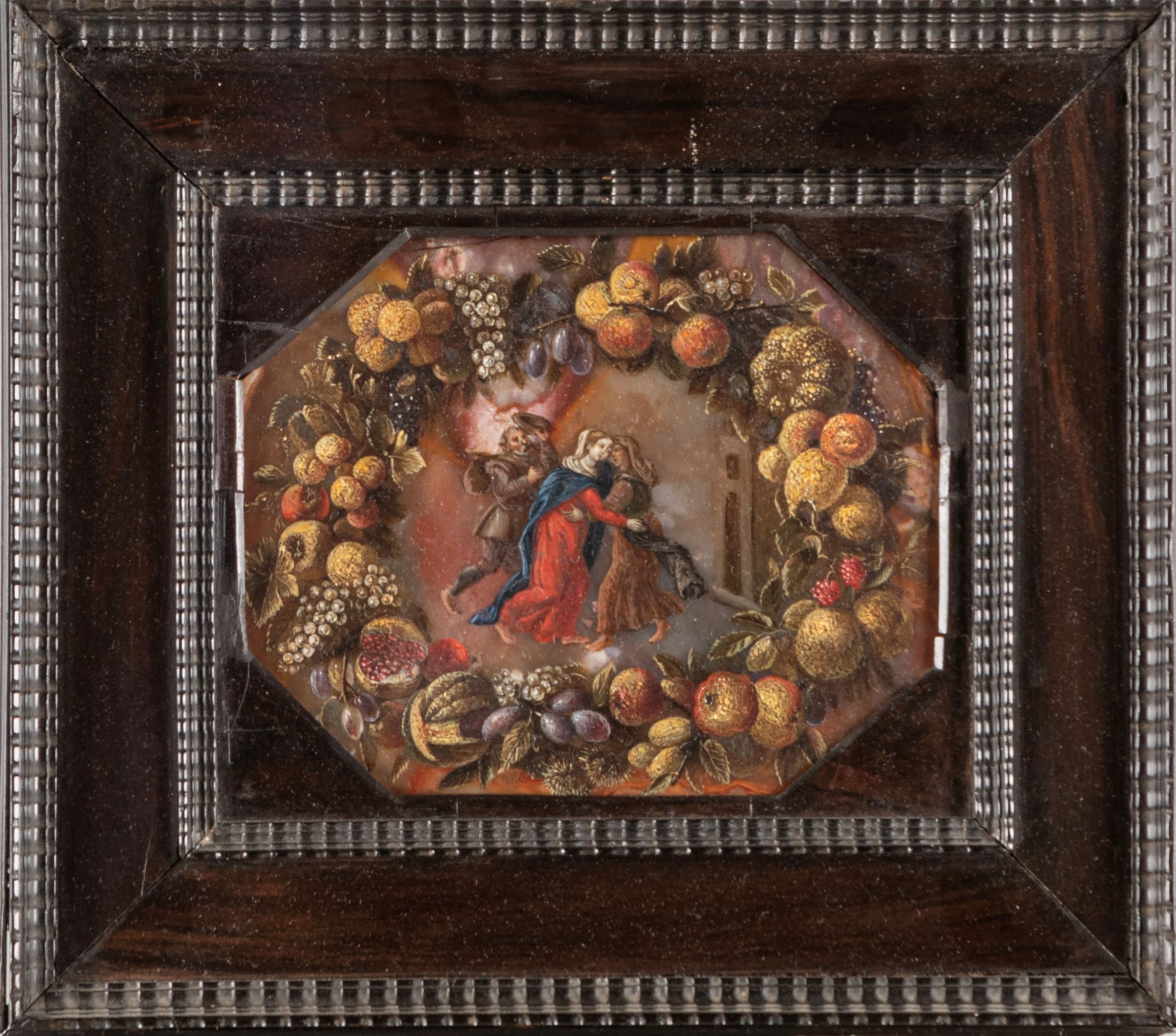 Scuola lombarda, secolo XVII, Visitazione entro ghirlanda di frutta